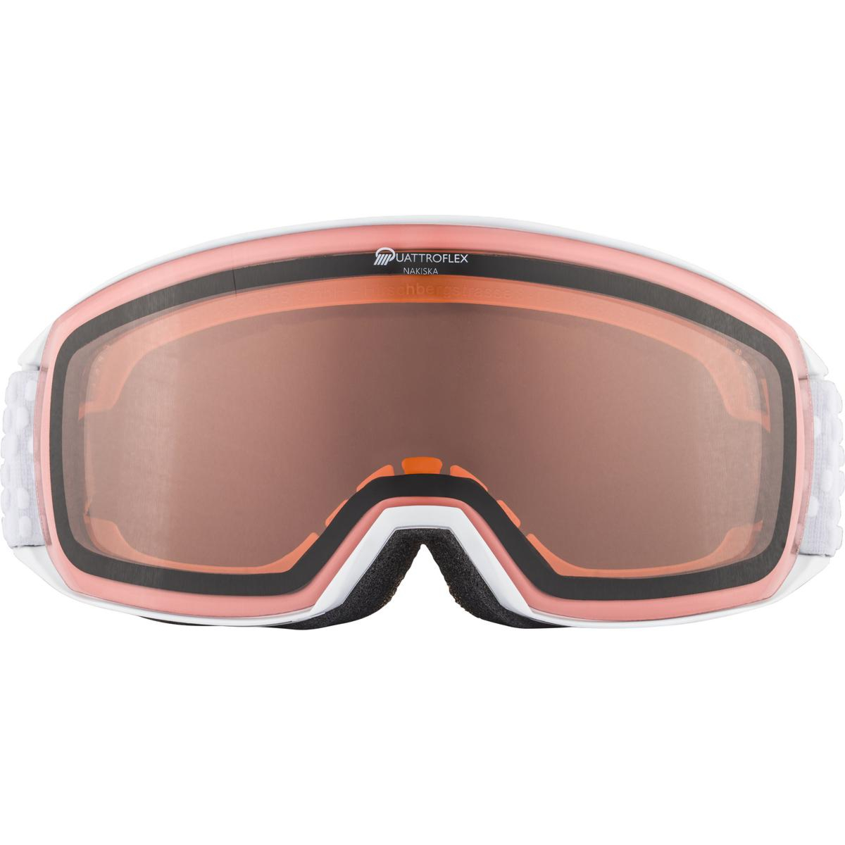Skijaške naočale NAKISKA Q prikladne su za srednje velika lica. Naočale su bez okvira s cilindričnom panoramskom lećom koja pruža neometan pogled. Verzija Quattroflex ima dvostruku leću koja poboljšava kontraste i omogućuje bolju vidljivost u difuznoj, raspršenoj svjetlosti. Dvostruka leća je otporna na lomljenje i pruža 100% UV zaštitu. Naočale moraju dobro pristajati kako bi savršeno sjedile na licu i odlično se uklopile s kacigom. Sofisticirani dizajn, vrhunska kvaliteta leća s izvrsnom ventilacijom (sustav Airframe venting), troslojna pjena, Fog-Stop zaštita od zamagljivanja te ukupni osjećaj udobnosti rezultat su višegodišnjeg razvojnog procesa njemačke tvrtke Alpina.