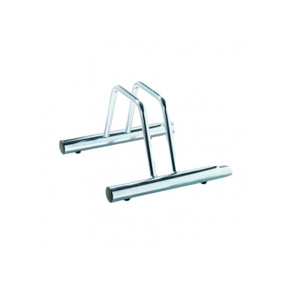 Stalak za bicikle na tlu. 1 mjesto u pocinčanom čeliku srebrne boje s mogućnošću spajanja u niz. Sa nogicama Dimenzije: dužina :38,5cm širina :40 cm visina : 26 cm težina : 2 kg jednostavna ambalaža, u slučaju kutije ili drugog, posebno ćemo navesti