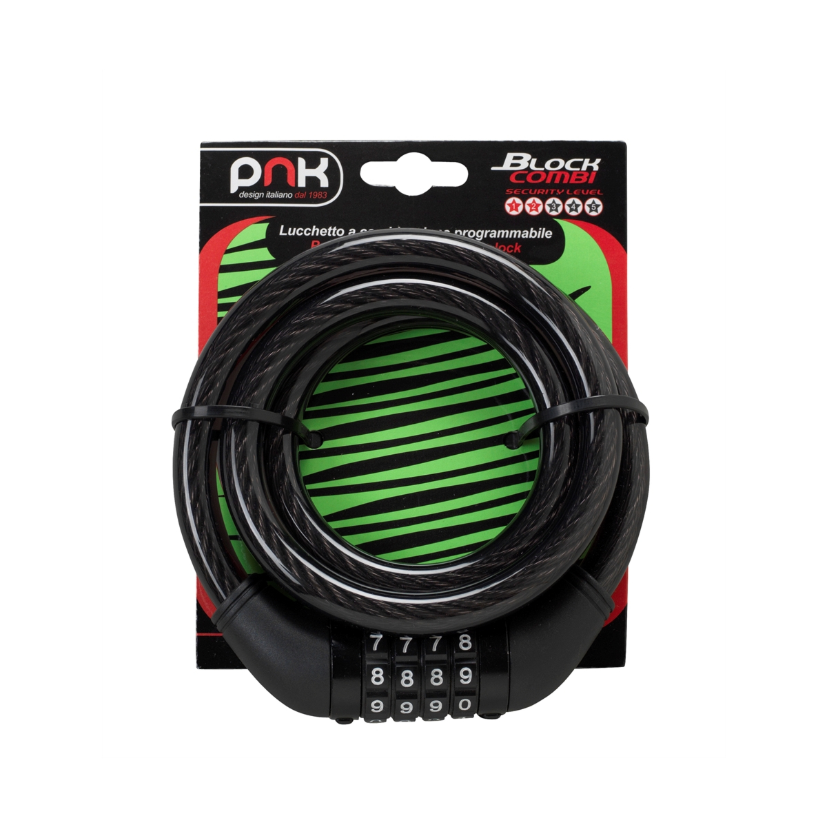 Lokot na broj sa kombinacijom brojeva koji se mogu programirati. Iz čelika prekriven transparentnom crnom plastikom. Duljine 1,2 m