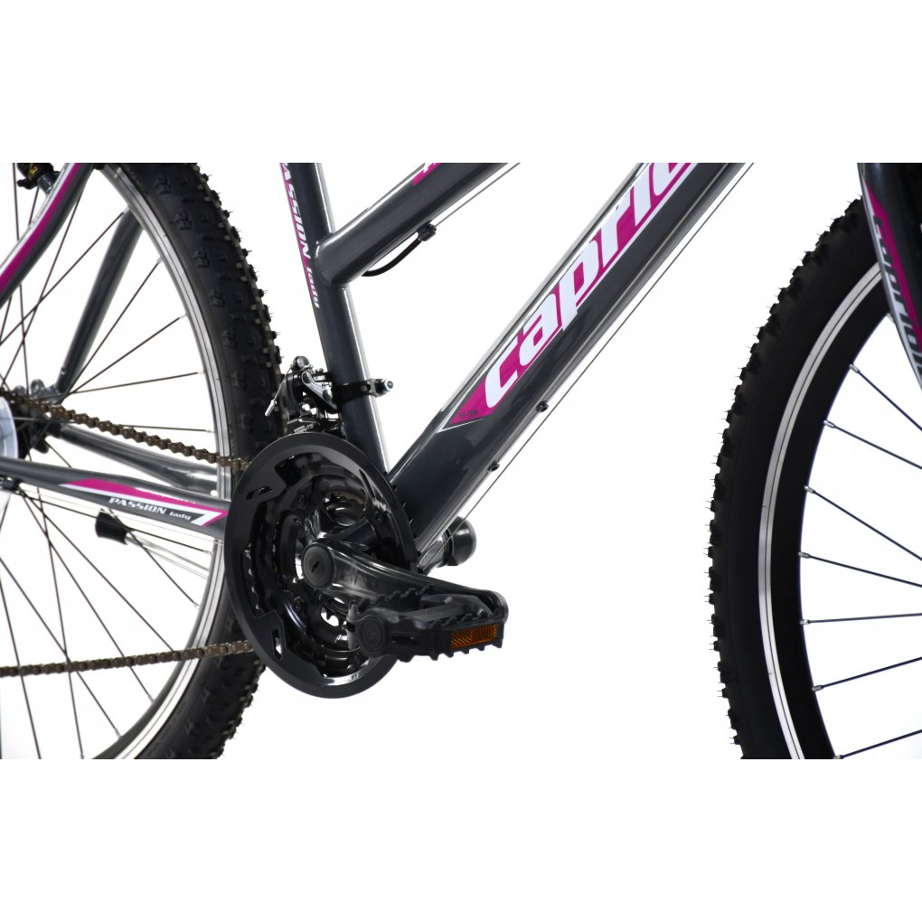 MTB PASSION LADY novi je model ženskih MTB bicikala od Capriola. Jedan od najprodavanijh modela Capriolo bicikala je upravo Passion serija, serija koja je po svim karakteristikama namijenjena ženama. PASSION LADY opremljen je prednjim i stražnjim 18-brzinskim SHIMANO TOURNEY mjenjačem. Udoban i siguran, idealan za vožnju gradom i po prirodi.