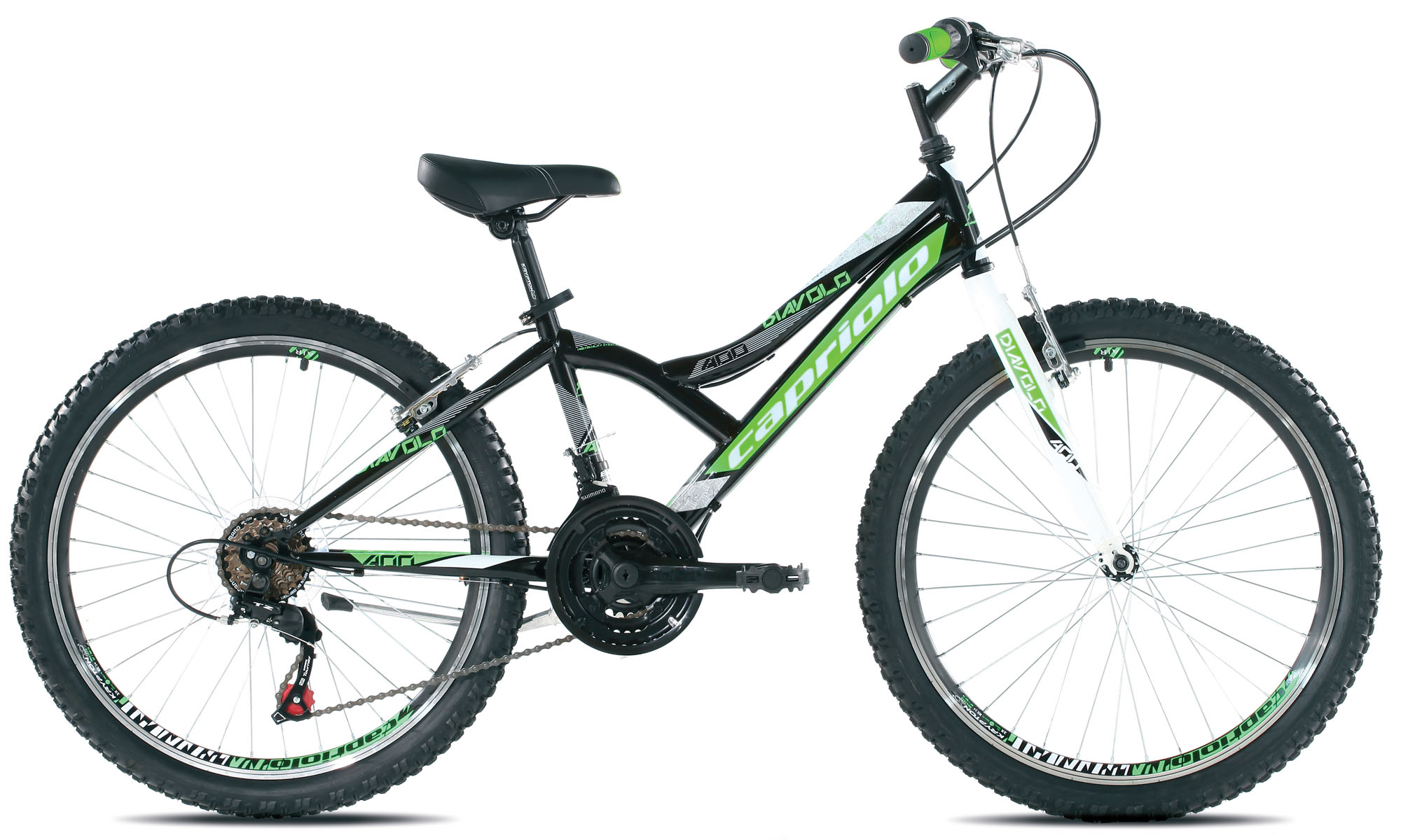 MTB DIAVOLO 400 nova je serija dječjih MTB od Capriola. MTB DIAVOLO 400 je opremljen prednjim i zadnjim 18-brzinskim SHIMANO TURNEY mjenjačem. Namjenjen za vožnju po stazama i prirodi, siguran i pouzdan, pristupačan svim korisnicima.