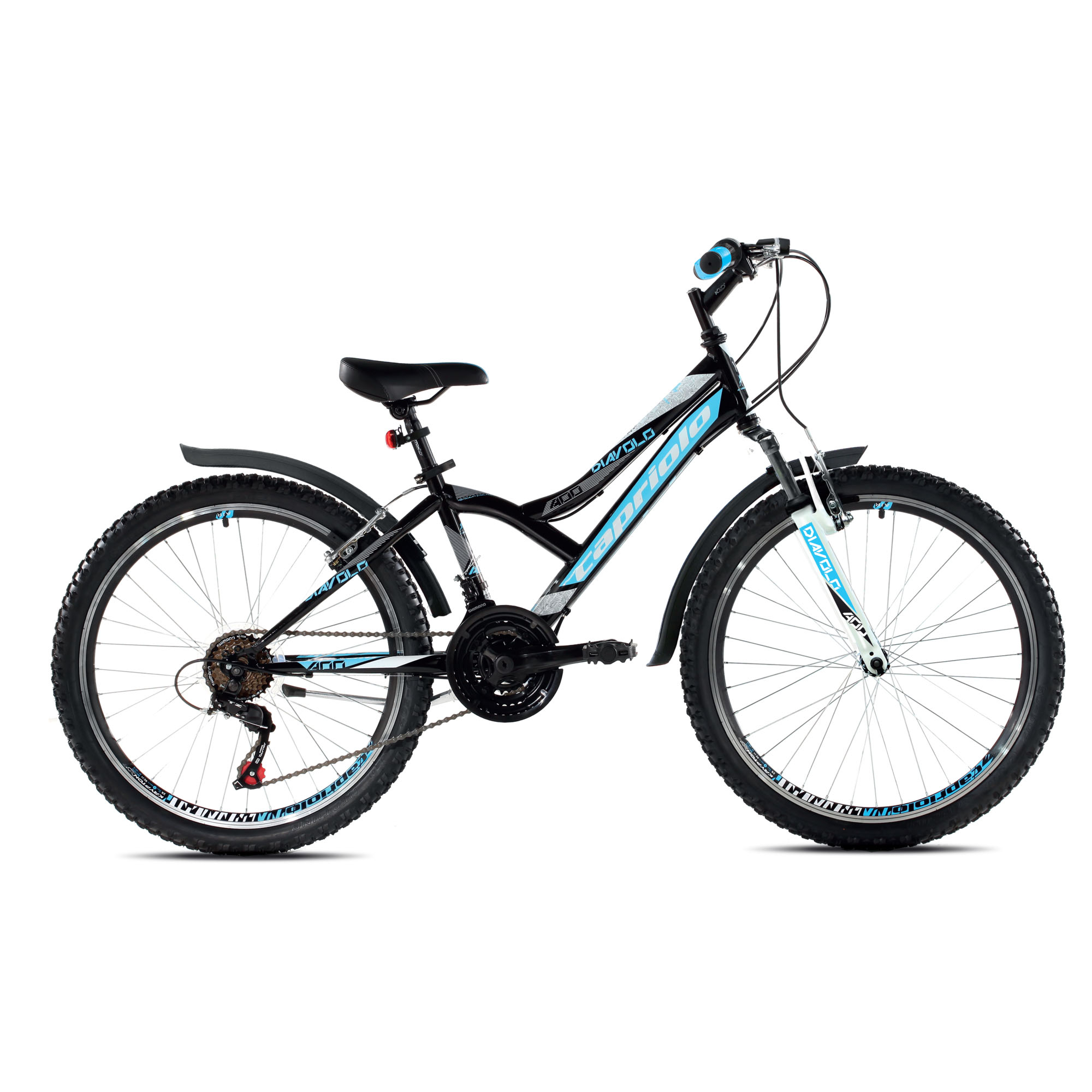 MTB DIAVOLO 400 FS nova je serija dječjih MTB od Capriola sa dodatnom opremom. MTB DIAVOLO 400 je opremljen prednjim i zadnjim 18-brzinskim SHIMANO TURNEY mjenjačem i prednjim SUSPENSION STEL FORK čeličnim amortizerom.