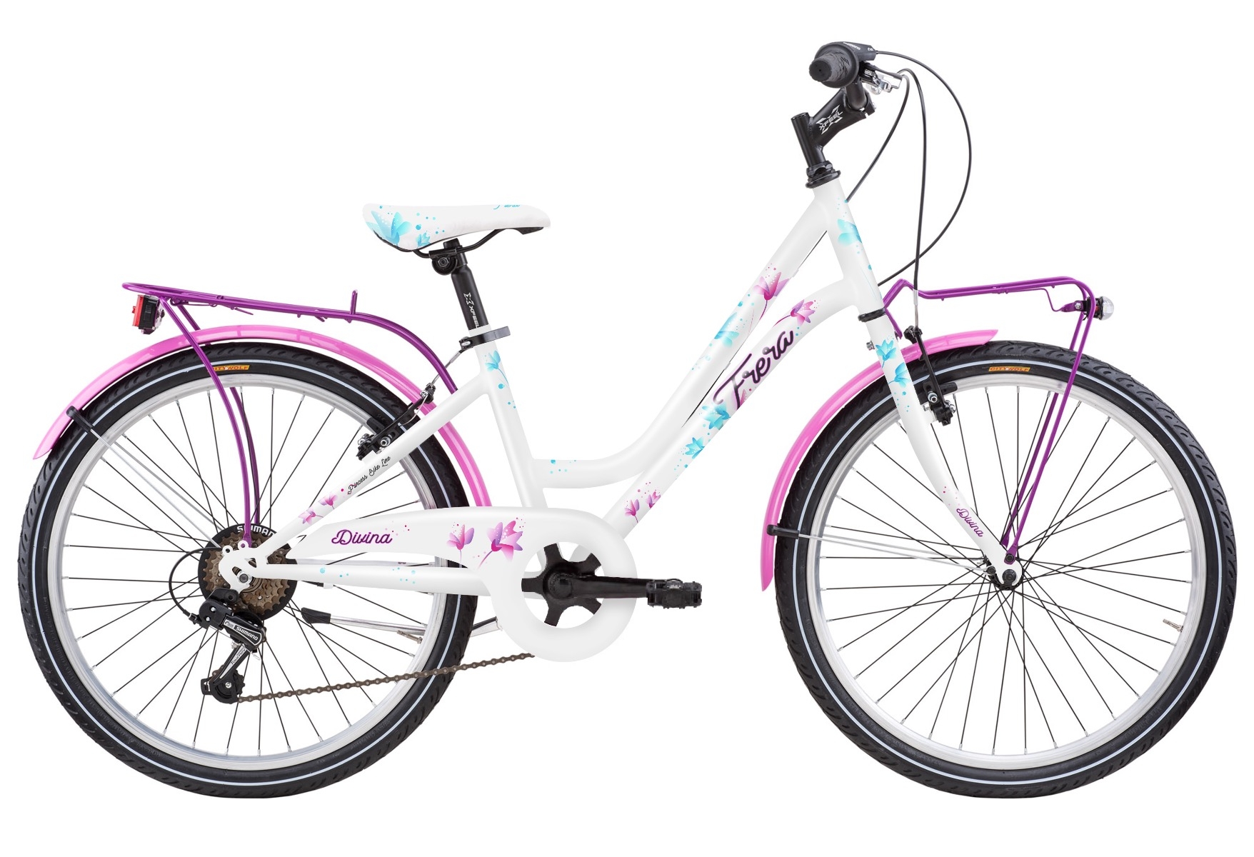 Dječji bicikl veoma zanimljivog dizajna i privlačnih boja za djevojčice. Izvrsni bicikl za istraživanje okoline opremljen blatobranima, zaštitom za lanac, svjetlima naprijed i odostraga te nosačima tereta naprijed i odostraga. Ergonomski izrađena konstrukcija bicikla omogućava veoma udobnu geometriju za kretanje u vožnju.